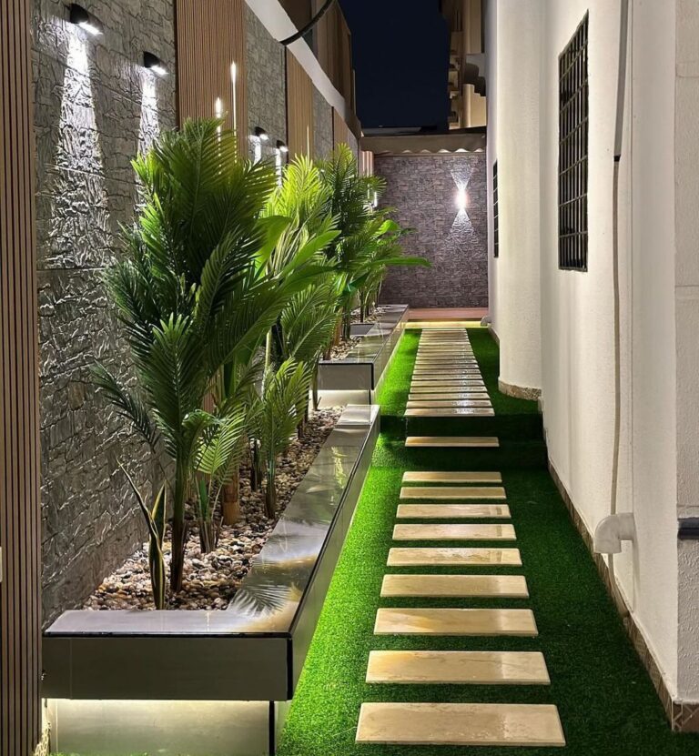 سواء كان الدرج داخل الفيلا أو في الحديقة الخارجية، فإننا نوفر حلولاً مبتكرة تجمع بين الأحواض الزراعية والديكورات الحجرية (الحصى الأبيض والأسود) ضمن تنسيق حدائق جازان. فريقنا الفني يضمن لك تنفيذاً دقيقاً يراعي سهولة العناية بالنباتات وتصريف المياه بأسلوب ذكي لا يؤثر على نظافة المكان، لتعزيز فخامة تنسيق حدائق جازان.