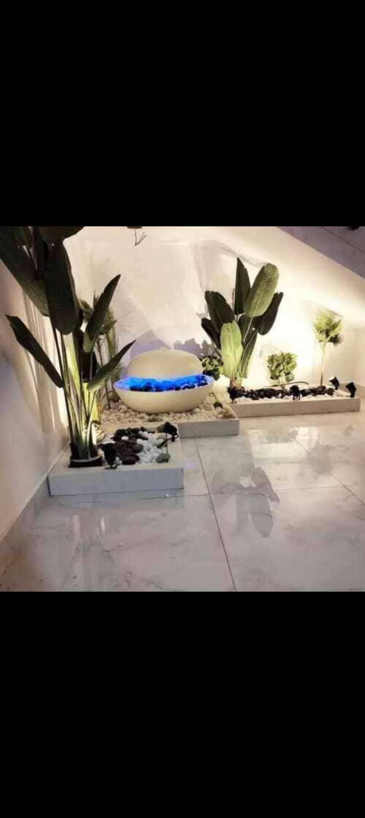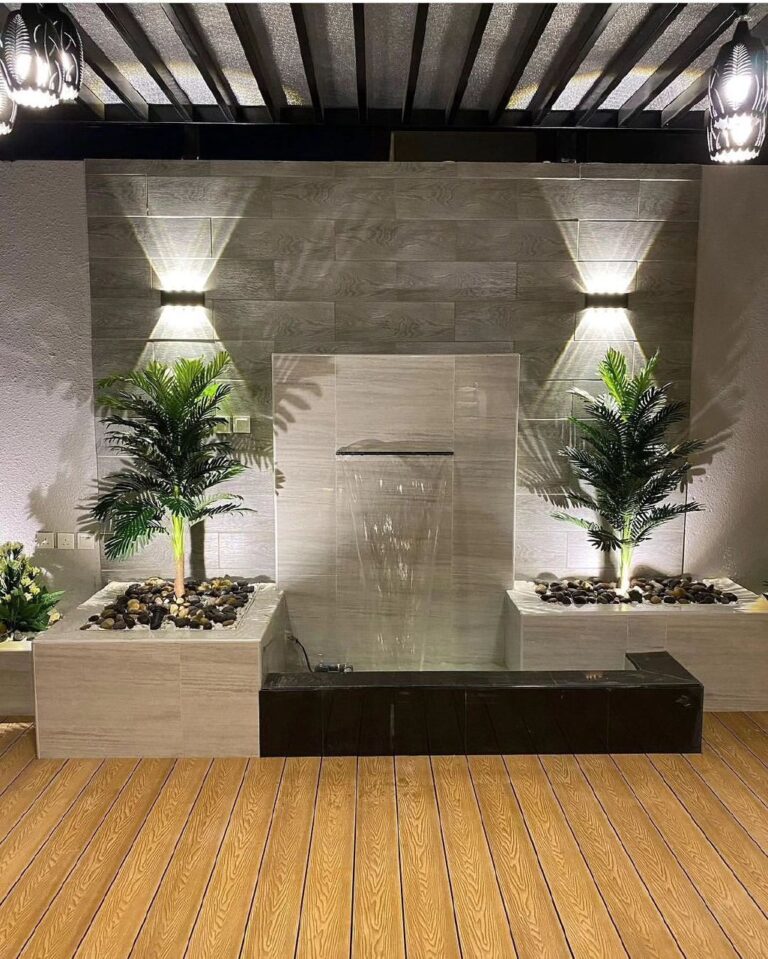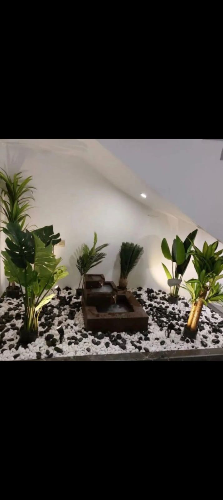 اختيار نباتات داخلية وخارجية تتناسب مع إضاءة المكان في جازان، مع توزيع الأحجار والنوافير الصغيرة داخل الأحواض.