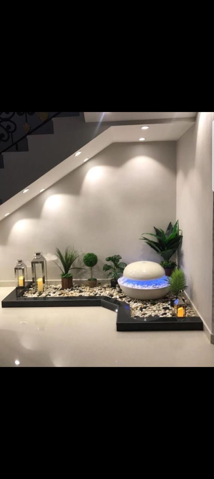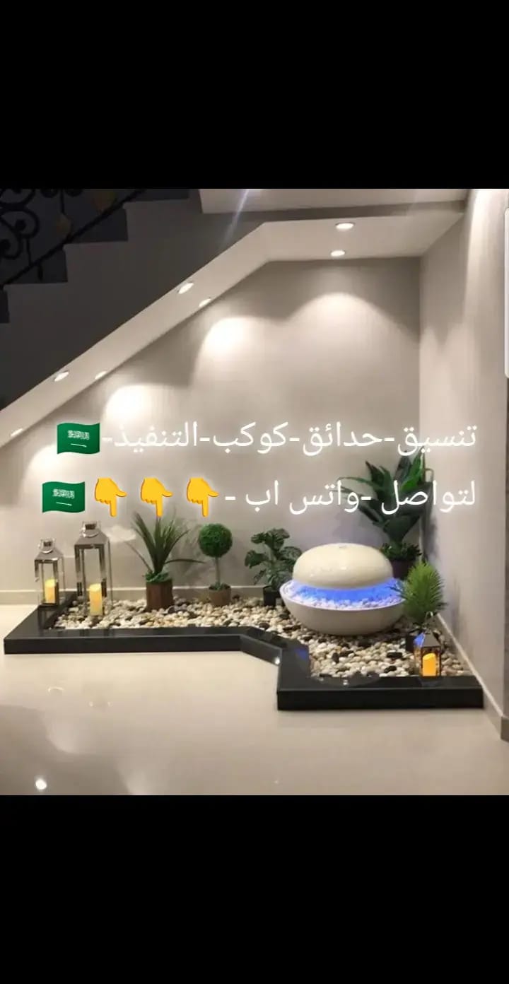 نحول المساحات الفارغة تحت الدرج إلى حدائق داخلية مصغرة باستخدام الأحجار الملونة، الإضاءة، والنباتات الظلية.